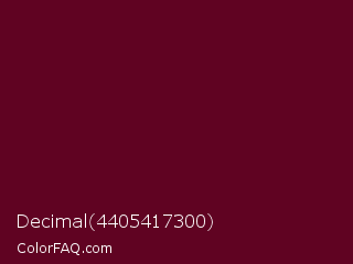 Decimal 4405417300 Color is a very dark rose color and the nearest color is Bordeaux #5c0120. Hex code #600322 and RGB value is rgb(96,3,34). In RGB color space, this color is composed of 38% red, 1% green, 13% blue, In CMYK color space, this color is composed of 0% cyan, 97% magenta, 65% yellow , 62% black , In HSL color space, this color has a hue angle of 340° , 94% saturation and 19% lightness.