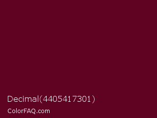 Decimal 4405417301 Color is a very dark rose color and the nearest color is Bordeaux #5c0120. Hex code #600323 and RGB value is rgb(96,3,35). In RGB color space, this color is composed of 38% red, 1% green, 14% blue, In CMYK color space, this color is composed of 0% cyan, 97% magenta, 64% yellow , 62% black , In HSL color space, this color has a hue angle of 339° , 94% saturation and 19% lightness.