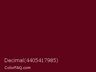 Decimal 4405417985 Color is a very dark red color and the nearest color is Bordeaux #5c0120. Hex code #600419 and RGB value is rgb(96,4,25). In RGB color space, this color is composed of 38% red, 2% green, 10% blue, In CMYK color space, this color is composed of 0% cyan, 96% magenta, 74% yellow , 62% black , In HSL color space, this color has a hue angle of 346° , 92% saturation and 20% lightness.