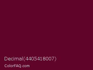 Decimal 4405418007 Color is a very dark rose color and the nearest color is Black Rose #67032d. Hex code #600429 and RGB value is rgb(96,4,41). In RGB color space, this color is composed of 38% red, 2% green, 16% blue, In CMYK color space, this color is composed of 0% cyan, 96% magenta, 57% yellow , 62% black , In HSL color space, this color has a hue angle of 336° , 92% saturation and 20% lightness.