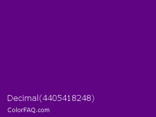 Decimal 4405418248 Color is a dark purple color and the nearest color is Pigment Indigo #4b0082. Hex code #600484 and RGB value is rgb(96,4,132). In RGB color space, this color is composed of 38% red, 2% green, 52% blue, In CMYK color space, this color is composed of 27% cyan, 97% magenta, 0% yellow , 48% black , In HSL color space, this color has a hue angle of 283° , 94% saturation and 27% lightness.