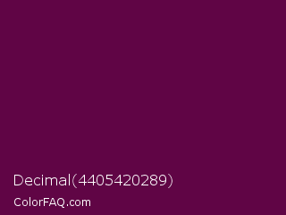 Decimal 4405420289 Color is a very dark magenta color and the nearest color is Pompadour #660045. Hex code #600545 and RGB value is rgb(96,5,69). In RGB color space, this color is composed of 38% red, 2% green, 27% blue, In CMYK color space, this color is composed of 0% cyan, 95% magenta, 28% yellow , 62% black , In HSL color space, this color has a hue angle of 318° , 90% saturation and 20% lightness.