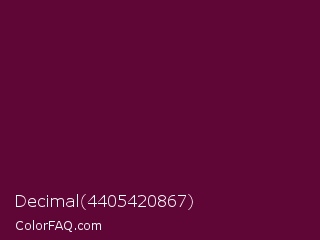 Decimal 4405420867 Color is a very dark magenta color and the nearest color is Mulberry Wood #5c0536. Hex code #600637 and RGB value is rgb(96,6,55). In RGB color space, this color is composed of 38% red, 2% green, 22% blue, In CMYK color space, this color is composed of 0% cyan, 94% magenta, 43% yellow , 62% black , In HSL color space, this color has a hue angle of 327° , 88% saturation and 20% lightness.