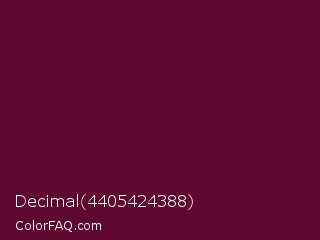 Decimal 4405424388 Color is a very dark rose color and the nearest color is Mulberry Wood #5c0536. Hex code #600930 and RGB value is rgb(96,9,48). In RGB color space, this color is composed of 38% red, 4% green, 19% blue, In CMYK color space, this color is composed of 0% cyan, 91% magenta, 50% yellow , 62% black , In HSL color space, this color has a hue angle of 333° , 83% saturation and 21% lightness.