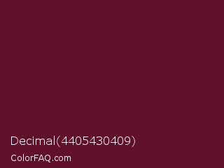Decimal 4405430409 Color is a very dark rose color and the nearest color is Black Rose #67032d. Hex code #601029 and RGB value is rgb(96,16,41). In RGB color space, this color is composed of 38% red, 6% green, 16% blue, In CMYK color space, this color is composed of 0% cyan, 83% magenta, 57% yellow , 62% black , In HSL color space, this color has a hue angle of 341° , 71% saturation and 22% lightness.