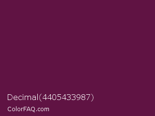Decimal 4405433987 Color is a dark magenta color and the nearest color is Wine Berry #591d35. Hex code #601343 and RGB value is rgb(96,19,67). In RGB color space, this color is composed of 38% red, 7% green, 26% blue, In CMYK color space, this color is composed of 0% cyan, 80% magenta, 30% yellow , 62% black , In HSL color space, this color has a hue angle of 323° , 67% saturation and 23% lightness.