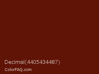 Decimal 4405434487 Color is a very dark red color and the nearest color is Dark Tan #661010. Hex code #601405 and RGB value is rgb(96,20,5). In RGB color space, this color is composed of 38% red, 8% green, 2% blue, In CMYK color space, this color is composed of 0% cyan, 79% magenta, 95% yellow , 62% black , In HSL color space, this color has a hue angle of 10° , 90% saturation and 20% lightness.