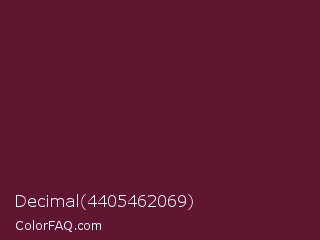 Decimal 4405462069 Color is a dark rose color and the nearest color is Wine Berry #591d35. Hex code #601633 and RGB value is rgb(96,22,51). In RGB color space, this color is composed of 38% red, 9% green, 20% blue, In CMYK color space, this color is composed of 0% cyan, 77% magenta, 47% yellow , 62% black , In HSL color space, this color has a hue angle of 336° , 63% saturation and 23% lightness.