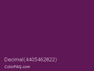 Decimal 4405462822 Color is a dark magenta color and the nearest color is Palatinate Purple #682860. Hex code #601756 and RGB value is rgb(96,23,86). In RGB color space, this color is composed of 38% red, 9% green, 34% blue, In CMYK color space, this color is composed of 0% cyan, 76% magenta, 10% yellow , 62% black , In HSL color space, this color has a hue angle of 308° , 61% saturation and 23% lightness.
