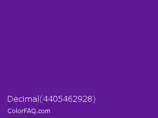 Decimal 4405462928 Color is a normal purple color and the nearest color is Daisy Bush #4f2398. Hex code #601796 and RGB value is rgb(96,23,150). In RGB color space, this color is composed of 38% red, 9% green, 59% blue, In CMYK color space, this color is composed of 36% cyan, 85% magenta, 0% yellow , 41% black , In HSL color space, this color has a hue angle of 274° , 73% saturation and 34% lightness.