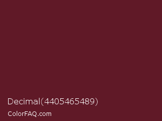 Decimal 4405465489 Color is a dark red color and the nearest color is Wine Berry #591d35. Hex code #601927 and RGB value is rgb(96,25,39). In RGB color space, this color is composed of 38% red, 10% green, 15% blue, In CMYK color space, this color is composed of 0% cyan, 74% magenta, 59% yellow , 62% black , In HSL color space, this color has a hue angle of 348° , 59% saturation and 24% lightness.