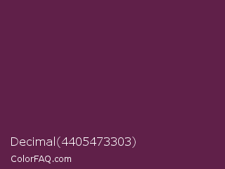 Decimal 4405473303 Color is a dark magenta color and the nearest color is Tawny Port #692545. Hex code #602049 and RGB value is rgb(96,32,73). In RGB color space, this color is composed of 38% red, 13% green, 29% blue, In CMYK color space, this color is composed of 0% cyan, 67% magenta, 24% yellow , 62% black , In HSL color space, this color has a hue angle of 322° , 50% saturation and 25% lightness.