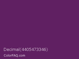 Decimal 4405473346 Color is a dark magenta color and the nearest color is Palatinate Purple #682860. Hex code #602062 and RGB value is rgb(96,32,98). In RGB color space, this color is composed of 38% red, 13% green, 38% blue, In CMYK color space, this color is composed of 2% cyan, 67% magenta, 0% yellow , 62% black , In HSL color space, this color has a hue angle of 298° , 51% saturation and 25% lightness.