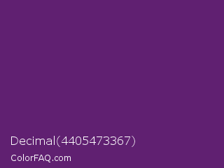 Decimal 4405473367 Color is a dark purple color and the nearest color is Imperial #602f6b. Hex code #602071 and RGB value is rgb(96,32,113). In RGB color space, this color is composed of 38% red, 13% green, 44% blue, In CMYK color space, this color is composed of 15% cyan, 72% magenta, 0% yellow , 56% black , In HSL color space, this color has a hue angle of 287° , 56% saturation and 28% lightness.