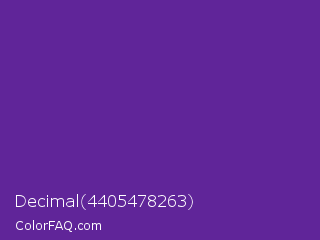 Decimal 4405478263 Color is a normal purple color and the nearest color is Rebecca Purple #663399. Hex code #602599 and RGB value is rgb(96,37,153). In RGB color space, this color is composed of 38% red, 15% green, 60% blue, In CMYK color space, this color is composed of 37% cyan, 76% magenta, 0% yellow , 40% black , In HSL color space, this color has a hue angle of 271° , 61% saturation and 37% lightness.