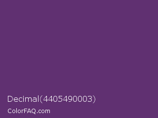 Decimal 4405490003 Color is a normal purple color and the nearest color is Imperial #602f6b. Hex code #603071 and RGB value is rgb(96,48,113). In RGB color space, this color is composed of 38% red, 19% green, 44% blue, In CMYK color space, this color is composed of 15% cyan, 58% magenta, 0% yellow , 56% black , In HSL color space, this color has a hue angle of 284° , 40% saturation and 32% lightness.