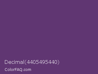 Decimal 4405495440 Color is a normal purple color and the nearest color is Imperial #602f6b. Hex code #603672 and RGB value is rgb(96,54,114). In RGB color space, this color is composed of 38% red, 21% green, 45% blue, In CMYK color space, this color is composed of 16% cyan, 53% magenta, 0% yellow , 55% black , In HSL color space, this color has a hue angle of 282° , 36% saturation and 33% lightness.