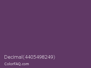 Decimal 4405498249 Color is a normal magenta color and the nearest color is Imperial #602f6b. Hex code #603865 and RGB value is rgb(96,56,101). In RGB color space, this color is composed of 38% red, 22% green, 40% blue, In CMYK color space, this color is composed of 5% cyan, 45% magenta, 0% yellow , 60% black , In HSL color space, this color has a hue angle of 293° , 29% saturation and 31% lightness.