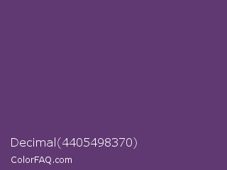 Decimal 4405498370 Color is a normal purple color and the nearest color is Imperial #602f6b. Hex code #603872 and RGB value is rgb(96,56,114). In RGB color space, this color is composed of 38% red, 22% green, 45% blue, In CMYK color space, this color is composed of 16% cyan, 51% magenta, 0% yellow , 55% black , In HSL color space, this color has a hue angle of 281° , 34% saturation and 33% lightness.