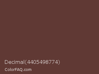 Decimal 4405498774 Color is a dark red color and the nearest color is Congo Brown #593737. Hex code #603934 and RGB value is rgb(96,57,52). In RGB color space, this color is composed of 38% red, 22% green, 20% blue, In CMYK color space, this color is composed of 0% cyan, 41% magenta, 46% yellow , 62% black , In HSL color space, this color has a hue angle of 7° , 30% saturation and 29% lightness.