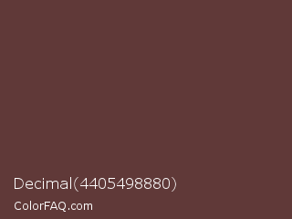 Decimal 4405498880 Color is a dark red color and the nearest color is Congo Brown #593737. Hex code #603938 and RGB value is rgb(96,57,56). In RGB color space, this color is composed of 38% red, 22% green, 22% blue, In CMYK color space, this color is composed of 0% cyan, 41% magenta, 42% yellow , 62% black , In HSL color space, this color has a hue angle of 2° , 26% saturation and 30% lightness.