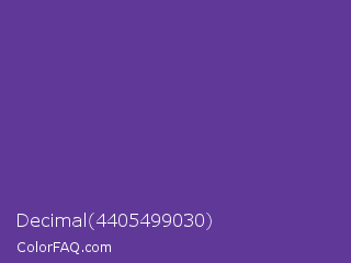 Decimal 4405499030 Color is a normal violet color and the nearest color is Rebecca Purple #663399. Hex code #603998 and RGB value is rgb(96,57,152). In RGB color space, this color is composed of 38% red, 22% green, 60% blue, In CMYK color space, this color is composed of 37% cyan, 63% magenta, 0% yellow , 40% black , In HSL color space, this color has a hue angle of 265° , 45% saturation and 41% lightness.