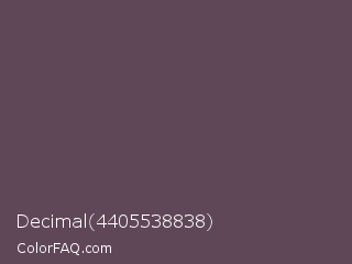 Decimal 4405538838 Color is a normal magenta color and the nearest color is Don Juan #5d4c51. Hex code #604758 and RGB value is rgb(96,71,88). In RGB color space, this color is composed of 38% red, 28% green, 35% blue, In CMYK color space, this color is composed of 0% cyan, 26% magenta, 8% yellow , 62% black , In HSL color space, this color has a hue angle of 319° , 15% saturation and 33% lightness.