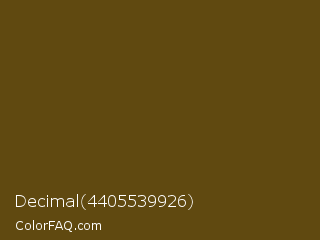 Decimal 4405539926 Color is a very dark orange color and the nearest color is Horses Neck #604913. Hex code #604910 and RGB value is rgb(96,73,16). In RGB color space, this color is composed of 38% red, 29% green, 6% blue, In CMYK color space, this color is composed of 0% cyan, 24% magenta, 83% yellow , 62% black , In HSL color space, this color has a hue angle of 43° , 71% saturation and 22% lightness.