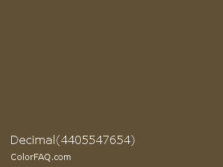 Decimal 4405547654 Color is a dark orange color and the nearest color is Kabul #5e483e. Hex code #605036 and RGB value is rgb(96,80,54). In RGB color space, this color is composed of 38% red, 31% green, 21% blue, In CMYK color space, this color is composed of 0% cyan, 17% magenta, 44% yellow , 62% black , In HSL color space, this color has a hue angle of 37° , 28% saturation and 29% lightness.