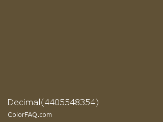 Decimal 4405548354 Color is a dark orange color and the nearest color is Kabul #5e483e. Hex code #605136 and RGB value is rgb(96,81,54). In RGB color space, this color is composed of 38% red, 32% green, 21% blue, In CMYK color space, this color is composed of 0% cyan, 16% magenta, 44% yellow , 62% black , In HSL color space, this color has a hue angle of 39° , 28% saturation and 29% lightness.