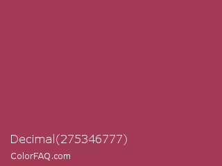 Decimal 275346777 Color is a normal rose color and the nearest color is Night Shadz #aa375a. Hex code #a33b57 and RGB value is rgb(163,59,87). In RGB color space, this color is composed of 64% red, 23% green, 34% blue, In CMYK color space, this color is composed of 0% cyan, 64% magenta, 47% yellow , 36% black , In HSL color space, this color has a hue angle of 344° , 47% saturation and 44% lightness.