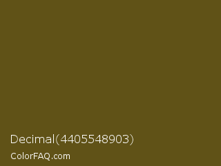 Decimal 4405548903 Color is a dark yellow color and the nearest color is West Coast #625119. Hex code #605217 and RGB value is rgb(96,82,23). In RGB color space, this color is composed of 38% red, 32% green, 9% blue, In CMYK color space, this color is composed of 0% cyan, 15% magenta, 76% yellow , 62% black , In HSL color space, this color has a hue angle of 48° , 61% saturation and 23% lightness.