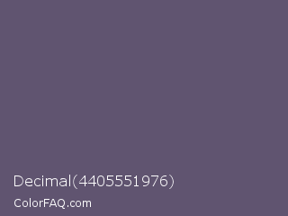 Decimal 4405551976 Color is a normal violet color and the nearest color is Smoky #605b73. Hex code #605470 and RGB value is rgb(96,84,112). In RGB color space, this color is composed of 38% red, 33% green, 44% blue, In CMYK color space, this color is composed of 14% cyan, 25% magenta, 0% yellow , 56% black , In HSL color space, this color has a hue angle of 266° , 14% saturation and 38% lightness.