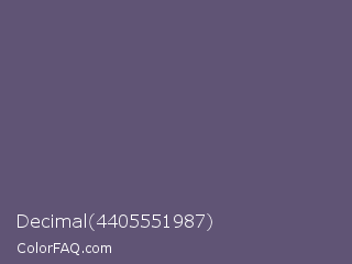 Decimal 4405551987 Color is a normal violet color and the nearest color is Smoky #605b73. Hex code #605475 and RGB value is rgb(96,84,117). In RGB color space, this color is composed of 38% red, 33% green, 46% blue, In CMYK color space, this color is composed of 18% cyan, 28% magenta, 0% yellow , 54% black , In HSL color space, this color has a hue angle of 262° , 16% saturation and 39% lightness.