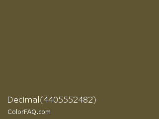 Decimal 4405552482 Color is a dark yellow color and the nearest color is Costa Del Sol #615d30. Hex code #605532 and RGB value is rgb(96,85,50). In RGB color space, this color is composed of 38% red, 33% green, 20% blue, In CMYK color space, this color is composed of 0% cyan, 11% magenta, 48% yellow , 62% black , In HSL color space, this color has a hue angle of 46° , 32% saturation and 29% lightness.