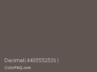 Decimal 4405552531 Color is a normal orange color and the nearest color is Wenge #645452. Hex code #605551 and RGB value is rgb(96,85,81). In RGB color space, this color is composed of 38% red, 33% green, 32% blue, In CMYK color space, this color is composed of 0% cyan, 11% magenta, 16% yellow , 62% black , In HSL color space, this color has a hue angle of 16° , 8% saturation and 35% lightness.