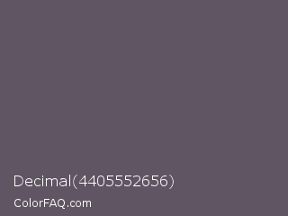 Decimal 4405552656 Color is a normal purple color and the nearest color is Scarpa Flow #585562. Hex code #605562 and RGB value is rgb(96,85,98). In RGB color space, this color is composed of 38% red, 33% green, 38% blue, In CMYK color space, this color is composed of 2% cyan, 13% magenta, 0% yellow , 62% black , In HSL color space, this color has a hue angle of 291° , 7% saturation and 36% lightness.
