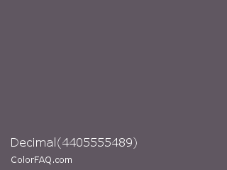 Decimal 4405555489 Color is a normal magenta color and the nearest color is Scarpa Flow #585562. Hex code #605761 and RGB value is rgb(96,87,97). In RGB color space, this color is composed of 38% red, 34% green, 38% blue, In CMYK color space, this color is composed of 1% cyan, 10% magenta, 0% yellow , 62% black , In HSL color space, this color has a hue angle of 294° , 5% saturation and 36% lightness.