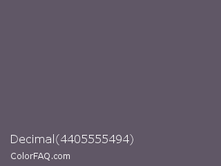 Decimal 4405555494 Color is a normal purple color and the nearest color is Scarpa Flow #585562. Hex code #605766 and RGB value is rgb(96,87,102). In RGB color space, this color is composed of 38% red, 34% green, 40% blue, In CMYK color space, this color is composed of 6% cyan, 15% magenta, 0% yellow , 60% black , In HSL color space, this color has a hue angle of 276° , 8% saturation and 37% lightness.