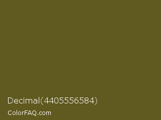 Decimal 4405556584 Color is a dark yellow color and the nearest color is Antique Bronze #665d1e. Hex code #605920 and RGB value is rgb(96,89,32). In RGB color space, this color is composed of 38% red, 35% green, 13% blue, In CMYK color space, this color is composed of 0% cyan, 7% magenta, 67% yellow , 62% black , In HSL color space, this color has a hue angle of 53° , 50% saturation and 25% lightness.