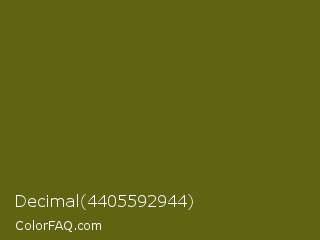 Decimal 4405592944 Color is a dark yellow color and the nearest color is Saratoga #555b10. Hex code #606412 and RGB value is rgb(96,100,18). In RGB color space, this color is composed of 38% red, 39% green, 7% blue, In CMYK color space, this color is composed of 4% cyan, 0% magenta, 82% yellow , 61% black , In HSL color space, this color has a hue angle of 63° , 69% saturation and 23% lightness.