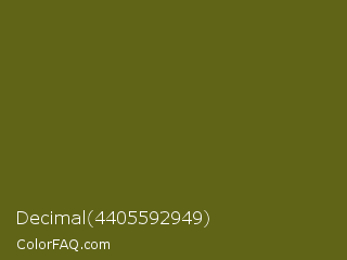 Decimal 4405592949 Color is a dark yellow color and the nearest color is Antique Bronze #665d1e. Hex code #606417 and RGB value is rgb(96,100,23). In RGB color space, this color is composed of 38% red, 39% green, 9% blue, In CMYK color space, this color is composed of 4% cyan, 0% magenta, 77% yellow , 61% black , In HSL color space, this color has a hue angle of 63° , 63% saturation and 24% lightness.