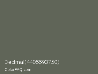 Decimal 4405593750 Color is a normal green color and the nearest color is Siam #646a54. Hex code #606558 and RGB value is rgb(96,101,88). In RGB color space, this color is composed of 38% red, 40% green, 35% blue, In CMYK color space, this color is composed of 5% cyan, 0% magenta, 13% yellow , 60% black , In HSL color space, this color has a hue angle of 83° , 7% saturation and 37% lightness.