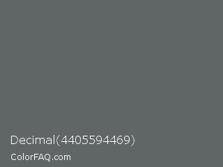 Decimal 4405594469 Color is a normal cyan color and the nearest color is Storm Dust #646463. Hex code #606665 and RGB value is rgb(96,102,101). In RGB color space, this color is composed of 38% red, 40% green, 40% blue, In CMYK color space, this color is composed of 6% cyan, 0% magenta, 1% yellow , 60% black , In HSL color space, this color has a hue angle of 170° , 3% saturation and 39% lightness.