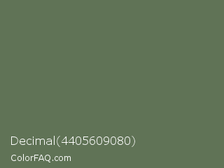Decimal 4405609080 Color is a normal green color and the nearest color is Cactus #587156. Hex code #607356 and RGB value is rgb(96,115,86). In RGB color space, this color is composed of 38% red, 45% green, 34% blue, In CMYK color space, this color is composed of 17% cyan, 0% magenta, 25% yellow , 55% black , In HSL color space, this color has a hue angle of 99° , 14% saturation and 39% lightness.