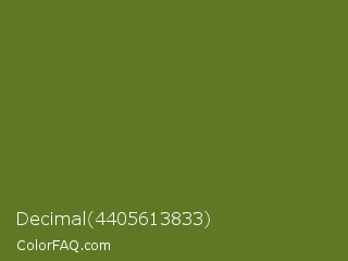 Decimal 4405613833 Color is a normal lime color and the nearest color is Fern Frond #657220. Hex code #607825 and RGB value is rgb(96,120,37). In RGB color space, this color is composed of 38% red, 47% green, 15% blue, In CMYK color space, this color is composed of 20% cyan, 0% magenta, 69% yellow , 53% black , In HSL color space, this color has a hue angle of 77° , 53% saturation and 31% lightness.