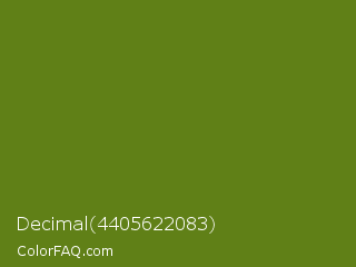 Decimal 4405622083 Color is a dark lime color and the nearest color is Fern Frond #657220. Hex code #608017 and RGB value is rgb(96,128,23). In RGB color space, this color is composed of 38% red, 50% green, 9% blue, In CMYK color space, this color is composed of 25% cyan, 0% magenta, 82% yellow , 50% black , In HSL color space, this color has a hue angle of 78° , 70% saturation and 30% lightness.