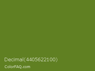 Decimal 4405622100 Color is a normal green color and the nearest color is Fern Frond #657220. Hex code #608022 and RGB value is rgb(96,128,34). In RGB color space, this color is composed of 38% red, 50% green, 13% blue, In CMYK color space, this color is composed of 25% cyan, 0% magenta, 73% yellow , 50% black , In HSL color space, this color has a hue angle of 80° , 58% saturation and 32% lightness.