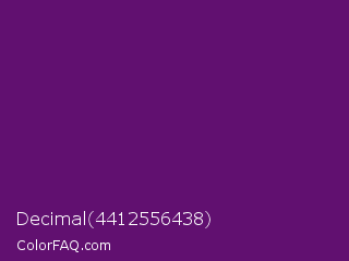 Decimal 4412556438 Color is a dark purple color and the nearest color is Honey Flower #4f1c70. Hex code #611070 and RGB value is rgb(97,16,112). In RGB color space, this color is composed of 38% red, 6% green, 44% blue, In CMYK color space, this color is composed of 13% cyan, 86% magenta, 0% yellow , 56% black , In HSL color space, this color has a hue angle of 291° , 75% saturation and 25% lightness.