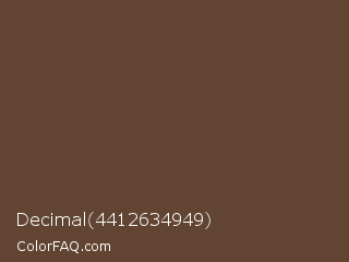 Decimal 4412634949 Color is a dark orange color and the nearest color is Quincy #623f2d. Hex code #614431 and RGB value is rgb(97,68,49). In RGB color space, this color is composed of 38% red, 27% green, 19% blue, In CMYK color space, this color is composed of 0% cyan, 30% magenta, 49% yellow , 62% black , In HSL color space, this color has a hue angle of 24° , 33% saturation and 29% lightness.